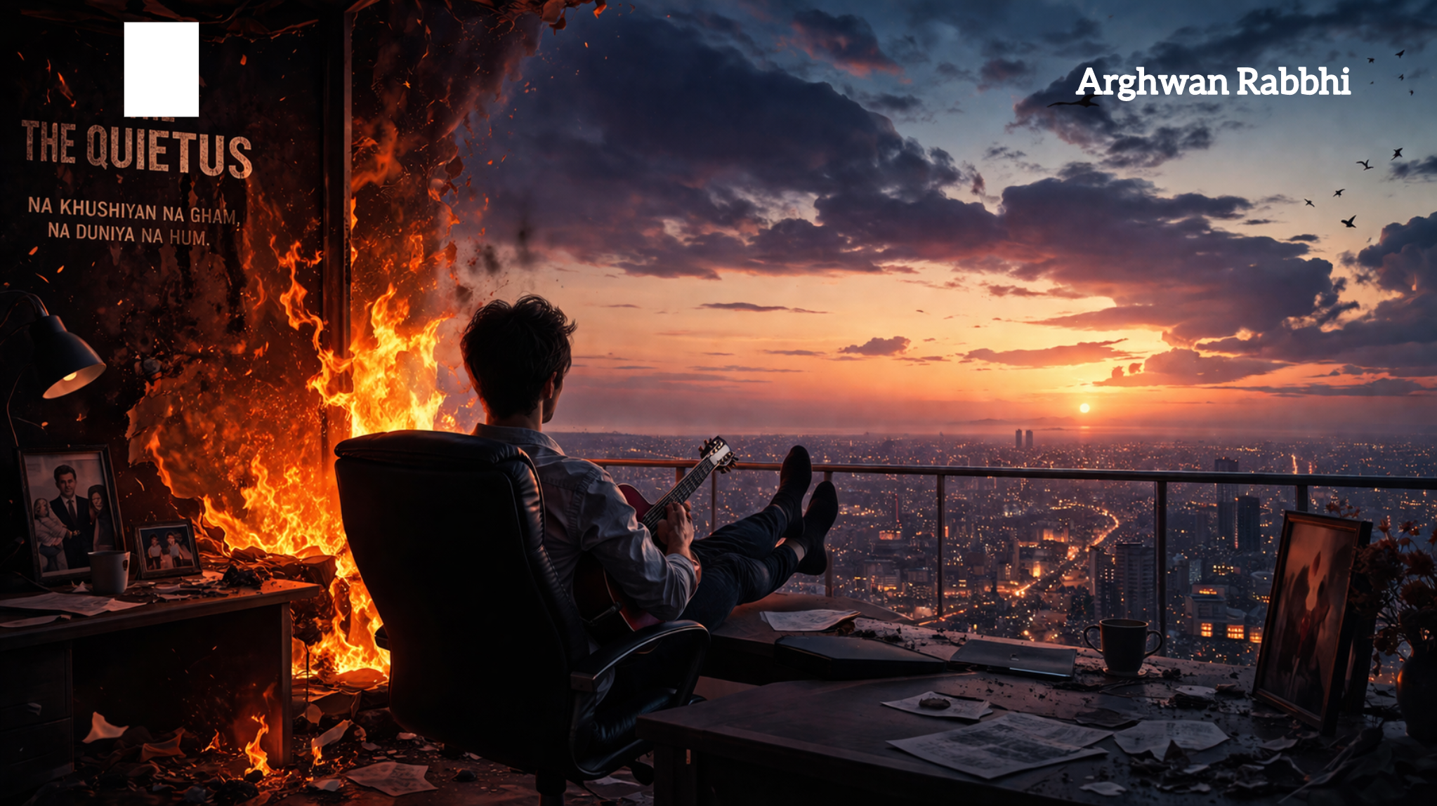 वो गिटार की तरफ़ गया, उठा लाया और बॉस की कुर्सी पे बैठ गया…बॉस अपने पाँव इस मेज़ पे रख के ये गिटार कभी-कभी बजाती होंगी … ये सोच के उसने अपने पाँव मेज़ पे रखने की कोशिश की लेकिन साफ़ मेज़ गन्दी ना हो जाए इसलिए उसने अपने जूते उतार दिए, मोज़े भी और फिर मोजों से दो-दो बार पैर साफ़ किए …. अब उसने पैर मेज़ पे रखे और गिटार को बजाने की कोशिश की, उसे गिटार बजाना नहीं आता… लेकिन वो बजा रहा था.. इतने में आग की तेज़ लपटें कमरे में दाख़िल हुईं और वो भागा ….गिटार ले के….